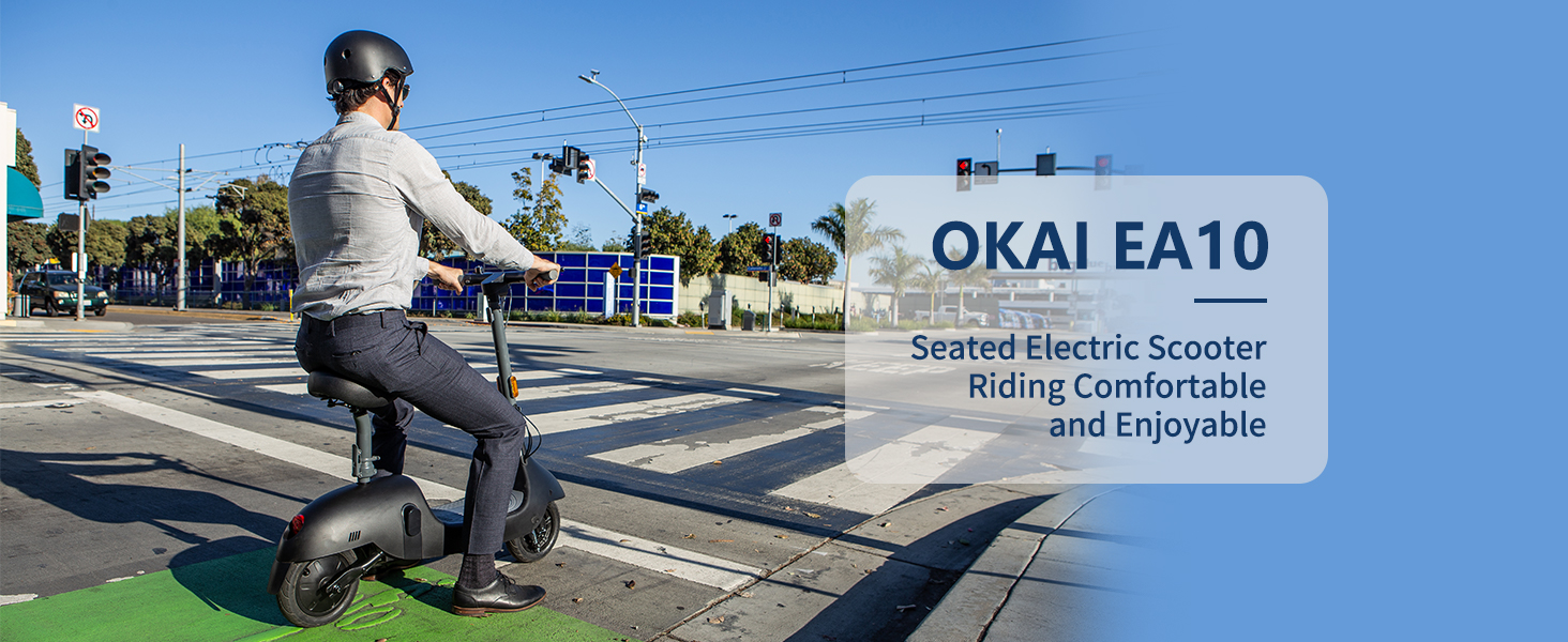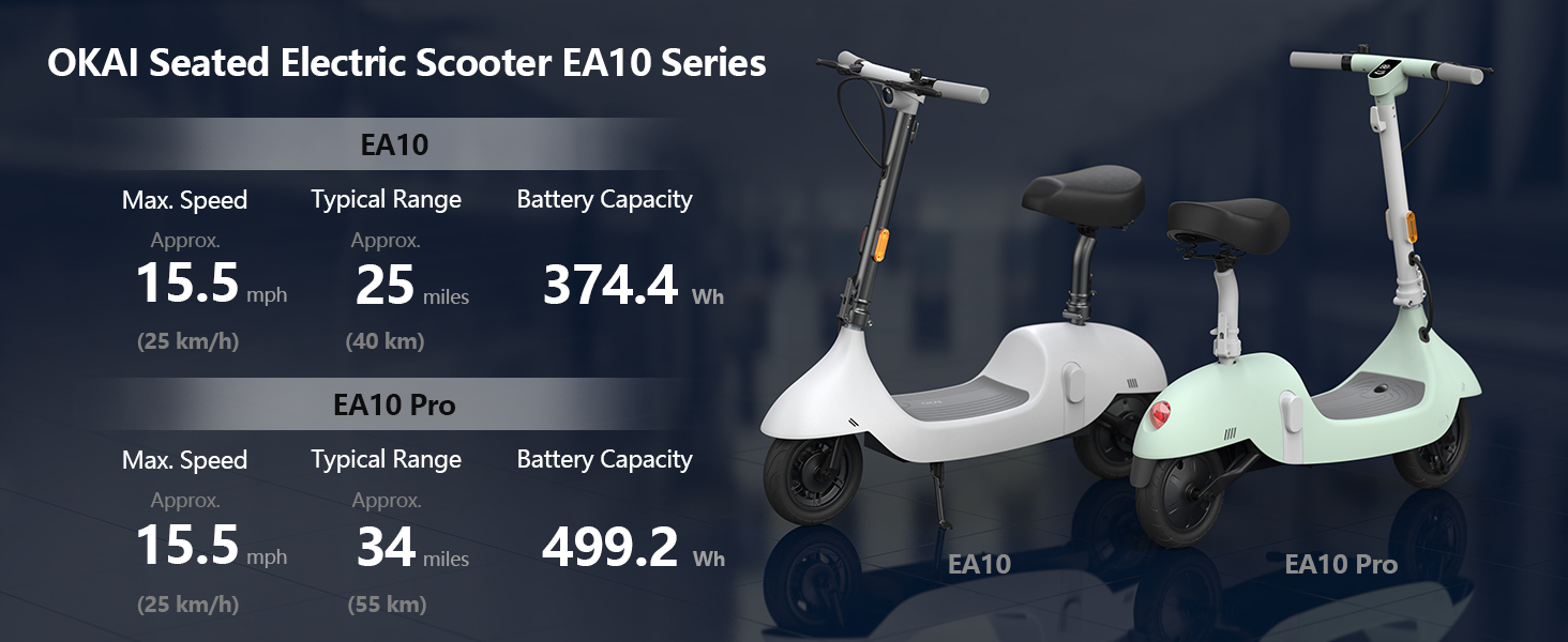 All New OKAI EA10 - The plastic body at the bottom is elegant and very impressive that can give you the touch of the car or Vespa scooters.It comes with a 36V 10.4Ah battery for 25 miles range.The 350W rear brushless gearless motor delivers a max output of 560W to tackle up to 20% inclines and promises a top speed of up to 15.5mph.