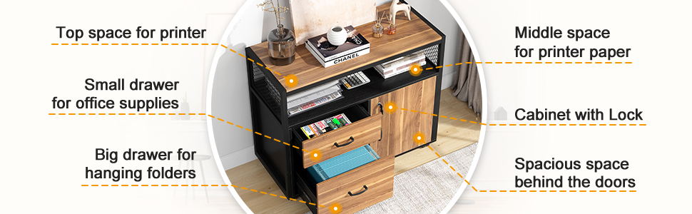 Also a good amount of storage space for office supplies and files, which the included filing cabinet provides, it's set up with rails for filing folders. This is your choice!